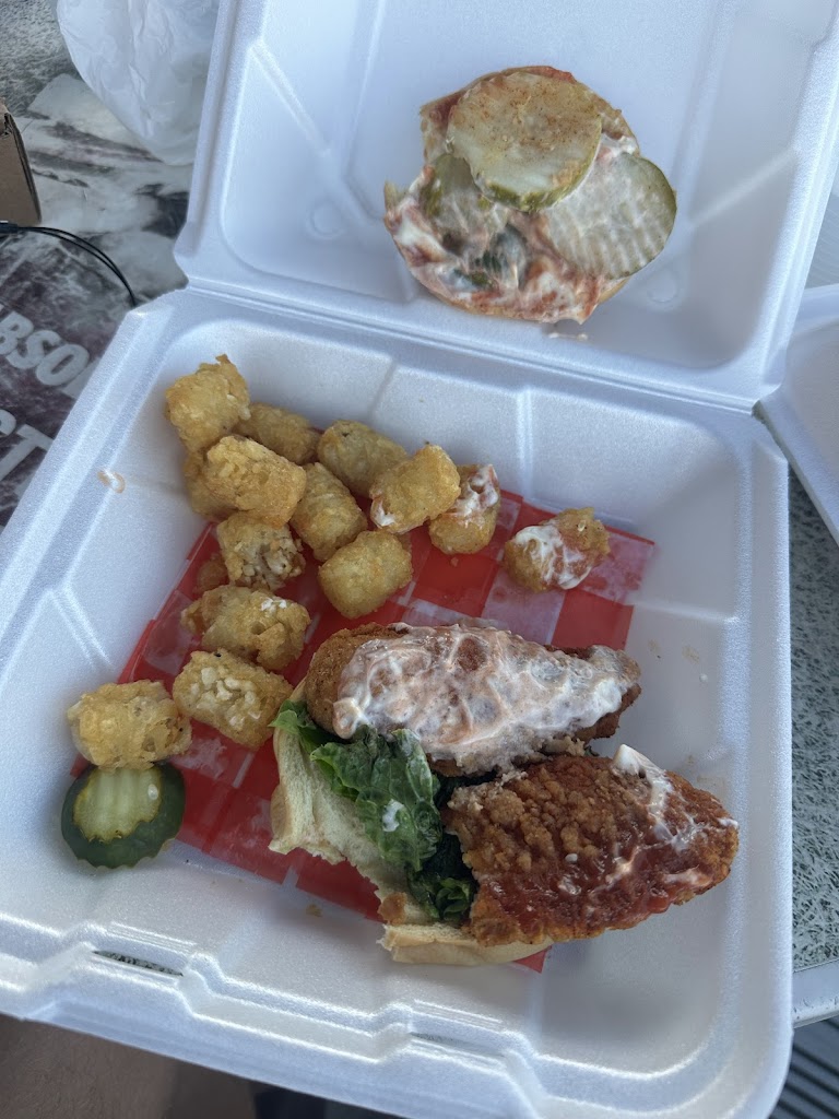 “Nashville Hot Chicken” sandwich was not spicy at all and was just 2 premade chicken strips and this is all the tater tots that came with it