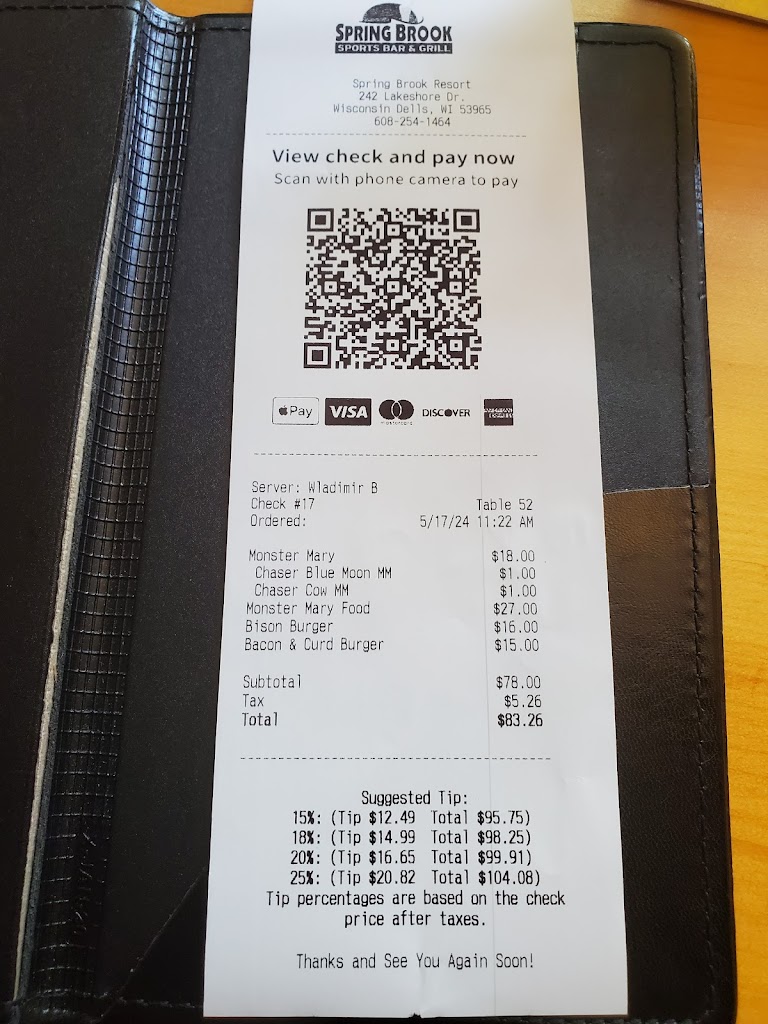 Writing this review after recently staying at the resort. This sports bar was the first place we stopped after a very long road trip, we we're hungry and wanting something decent, and decided to walk on over and check it out. Upon arrival, we were seated immediately and the waitress comes out, she seemed very neutral. I couldn't tell if she was happy or very upset. Not very welcoming.. it was kind of eerie. Ended up ordering a "jumbo" hotdog for 10 dollars, and my friends ordered some sandwiches. The "jumbo" 1/4lb hotdog seemed very small, it was pretty much a plain ballpark hotdog boiled, with a very very small scoop of fries. Everyone at the table was almost upset for even ordering here, small portions, very bland, no flavor, extremely high priced items that do not match quality/portions of ANY restaurant I have been to in my life. I get that it's a resort and all, I expected food prices to be higher, but this establishment is taking advantage over their guests in a way that is not right. You could go to a fine restaurant in the dells and get a well crafted burger/ sandwich, etc and it'll be half the price, flavorful, and 2x the portion size. Spring Brook Bar & Grill was a huge let down for everyone at our table, and we were left hungry after eating. *Instead of taking advantage over tourists to squeeze more money out of a meal, at least make sure the quality & portions of what's coming out matches the price. Quit charging fine dining prices for sonic quality food*