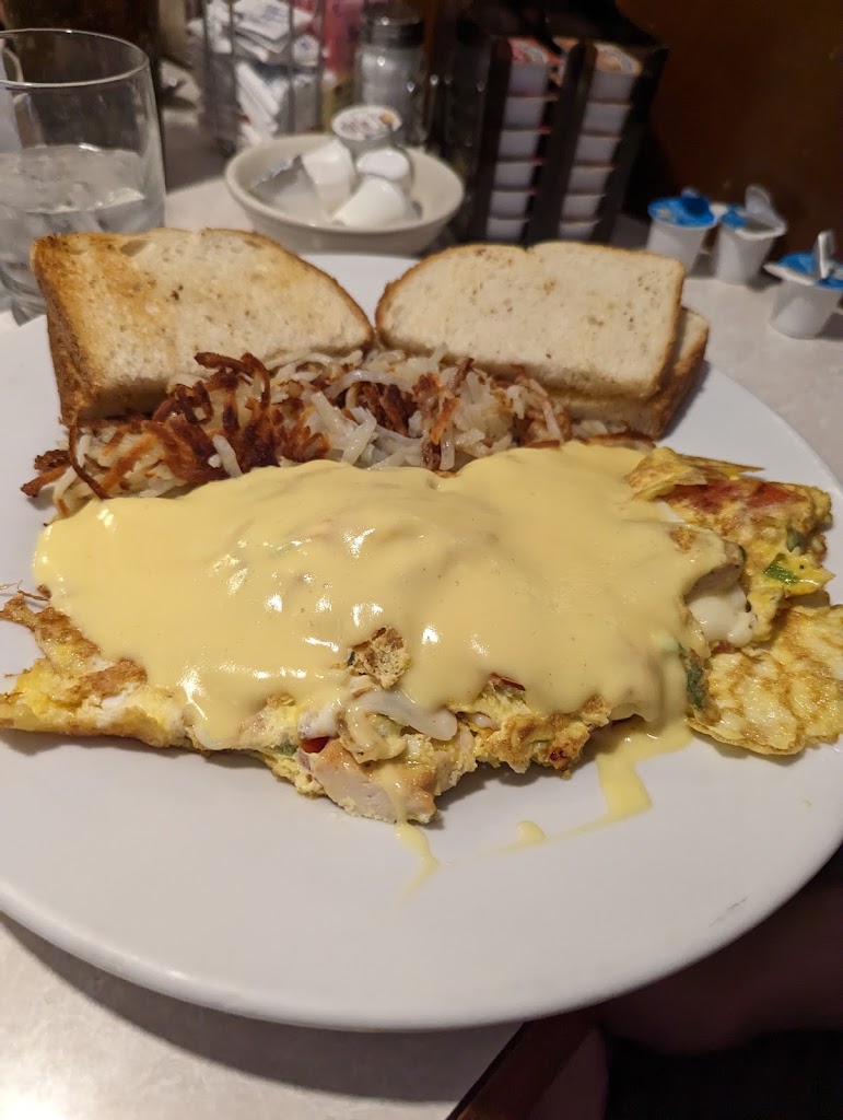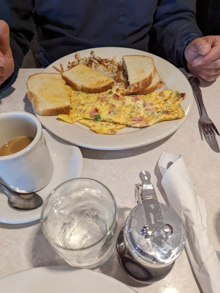 Stopped in while traveling thru the state. Breakfast was hot and delicious. Coffee kept flowing. Fair prices. Good service.