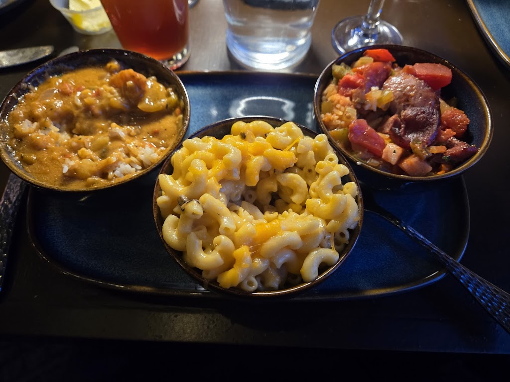 We arrived at 5:30pm and, with only two other tables occupied, we didn't get our meal until 7pm. It arrived less than lukewarm. I ordered three sides: Truffle Mac and cheese, Shrimp Etouffee and Jambalaya. The Mac and cheese had the texture of reheated Mac and cheese from a box, flavorless dry and crusty (a far cry from my gooey memories of yore). The other two sides had a monochromatic flavor with cookie cutter cubes of ham and peppers, and the tomatoes tasted like they were out of a can. I asked the server to please heat my food, and it was returned to the table looking worse for the wear and barely warm.