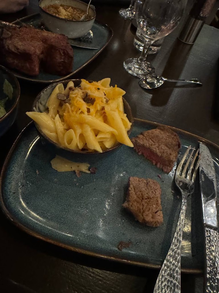 The food? Incredible. The strawberry dinner was a standout, the bruschetta was a table-wide favorite, perfectly balanced with sweet, savory, and just the right amount of honey heat. The porterhouse was cooked to perfection, and the Pasta St. Charles was a-maze-ing.