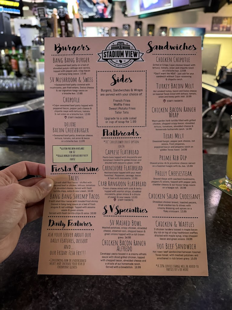 If you're in town for an event or game you are not going to find a better atmosphere than Stadium View! Great staff fast service and the BEST game day pre/post game party! Highly recommend making this a place a stop on your list!