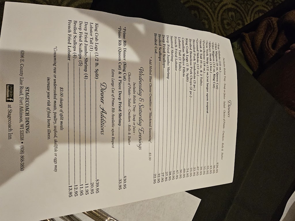 We go to Stage Coach on occasion. It is always very good. Like many places I don’t stray too far from the things I like. The French onion soups is excellent one of the best I’ve had at a supper club or any restaurant, the sirloin and ribeye are excellent cuts and always done as requested. I love the au gratin potatoes they are just creamy enough without being soupy. I like to add shrimp they aren’t the best in the world, but we’re in WI. I highly advise making a reservation. Great restaurants are a bit hit and miss here so they book up quickly. There isn’t a shortage of restaurants around here, but there is a shortage of consistently great restaurants.