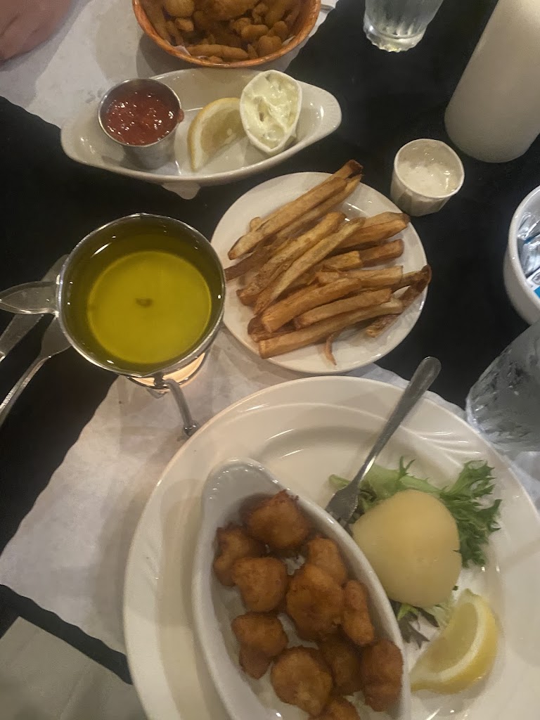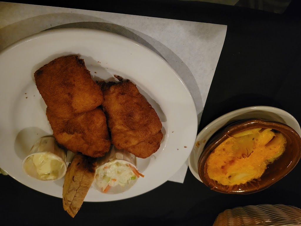 I had the broiled cod that was served on a hot plate with drawn butter baked potatoes and coleslaw. It was excellent!