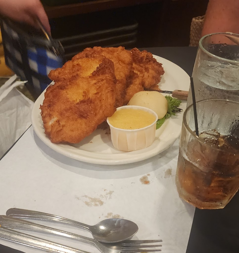 The Friday fried cod was tasty and had a large portion size. Very nice atmosphere.
