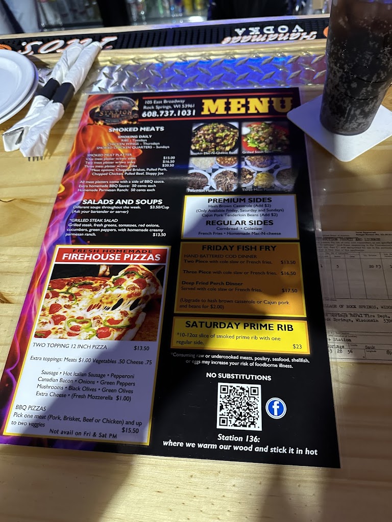 So glad to have Station 136 in town. Great food and friendly staff. Specials: Thursday night wings. Friday fish fry. I will be back for more.