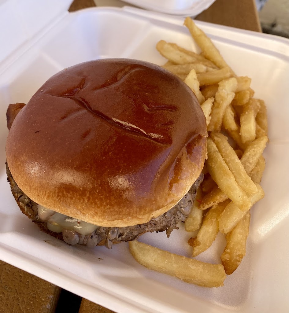 Had our dog, so we sat out in the court yard. Ordered to go n had a great beer. Brat on a pretzel bun with fries. Very good.