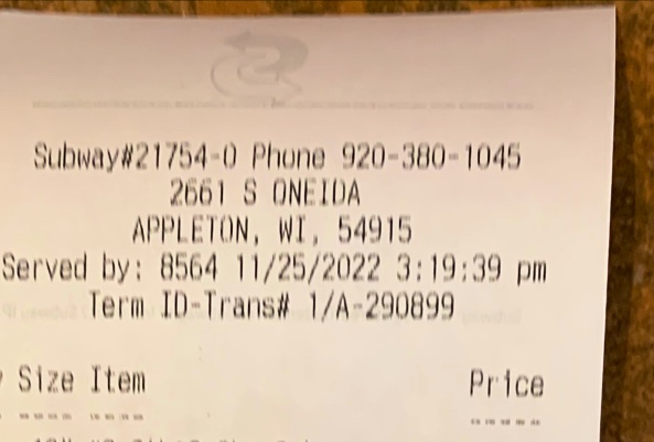 We haven’t been to Subway in YEARS!! Today my youngest clipped coupons out of the book that came in the mail. (We rarely EVER use coupons lol she said she was just bored?) Well when we looked at them, and saw one that said 3 footlong subs for $19.99…we thought that was a pretty great deal for our family of 4!!( the girls split one foot long). ANYWAYS… there was only one young man working by himself! Let me tell you that he is REALLY great with people! He remains calm, he is very thorough when asking how we want our subs prepared, makes suggestions, doesn’t just quickly rush making your subs… he took the time to make each sub with care and picture perfect looking too! ( I regret not getting a picture of them!!) He also acknowledges and engages with the other customers who are waiting in line letting them know he will be with them shortly etc. Taking time to really give individual attention to each customer and not just whip through the process to get people out the door! From the moment he greeted us to the moment of check out( wrapping, labeling, and bagging up the subs, pretzel, cookies and chips) everything he did was done with such expertise! Oh and that Pretzel was really good too!!! He then explained to me how to scan the QR code to become a MVP Rewards Member(which I did once I got home :) ) I am sooo glad that our first time back to subway in years ended up being SUCH a pleasant experience all around! Amazing Food, Amazing Service, and a Calm and Inviting Atmosphere with the employee’s chill and warm vibe!! I left a 20% tip on my debit card but that wasn’t good enough because I know the employees don’t get much of the tips off of cards… so I went to the gas station next door quick to by something just to get some cash back…BUT they did not offer cash back on cards :( so I then used the ATM which charges $2 just to pull off a $20 bill!! I walked it back over to him and he was shocked and beyond grateful for my tip! I told him he deserves it because he really is awesome and does such a great job! He thanked me so much! For the record this was (Store #21754-0 the subway on south Oneida st Appleton, WI Inside the Fox Convenience gas station!) This rock star employee’s Name is Quinton! I hope his boss sees my review and gives him a lil raise and Kudos!!!