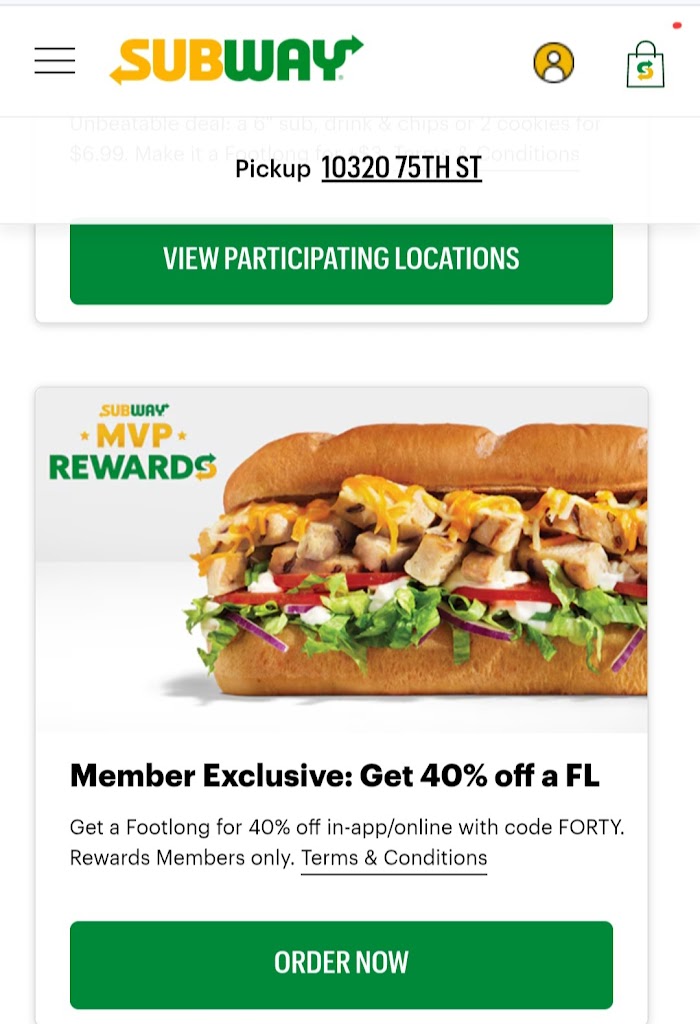 Do not use this location for your subway orders. Another order cancelled. This is the second time this location has cancelled the order even though they are listed as the "Participating Location" on their website. I don't know if the owner/manager of this location is trying to make more profit by not honoring the offers (coupons) and deals, or if there is a miscommunication between them and the corporate. Either way, I will ask the corporate again to look into this matter. Customer shouldn't have to find out their order is cancelled until they arrive to pick up the order.