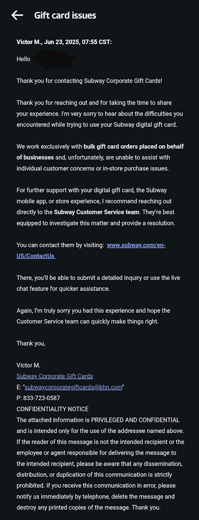 I go to this location. Food was made correctly, yay. Once again I find myself unable to pay with the digital QR gift card. I add the gift card to my subway account. Manager can't bring up the gift card on their end when I enter my account information, the app does not produce any information other than the card exist in my account. Manager tells me to print it out and then they can try to scan it again or they can then enter the numbers manually; said numbers are already under the digital QR code but they apparently can't enter those numbers. I'm once again told to print it im also told to call customer support. Staff making my food were quite nice, the manager on the other hand seemed disinterested in finding a solution and asked me if i could pay another way. Beyond frustrated at this point I ask for a discount for the inconvenience. I'm told no becuse none of this is their fault because the app and the gift cards are a third party system. I pay with my debit card and leave becuse I've now dealt with this for an hour and a half.