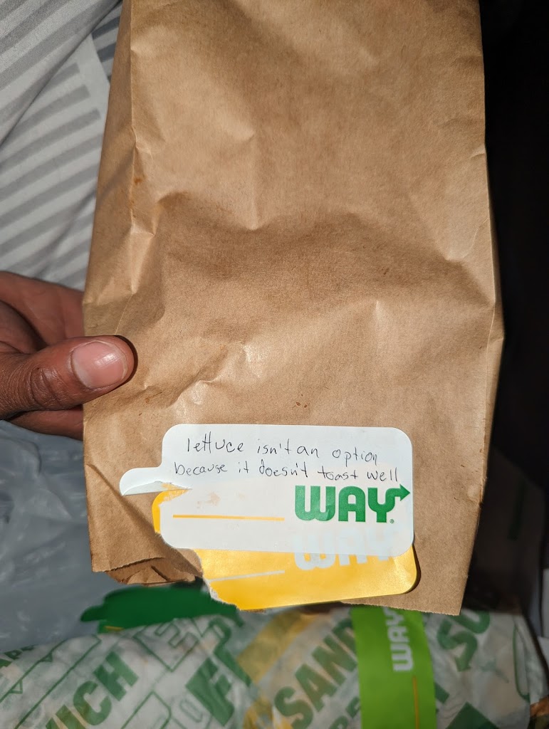 Typically have issues with subway. But today was an icing on the cake. One sub I ordered was not even wrapped, just but in a paper bag. Also, I put down to add lettuce to one of the subs in the comments because it wasn't a veggie option and I know you typically don't "toast" veggies (been going to subway since I was a little kid) and when I received my sub. I didn't have lettuce and there was a written note stating that it wasn't an option because lettuce doesn't toast well. It has always been custom that the only thing that gets toasted is the bread, meat, and cheese if the customer wants it that way or the meat needs to be put in the toaster oven. I myself have worked in food service, especially a business that literally makes only subs.