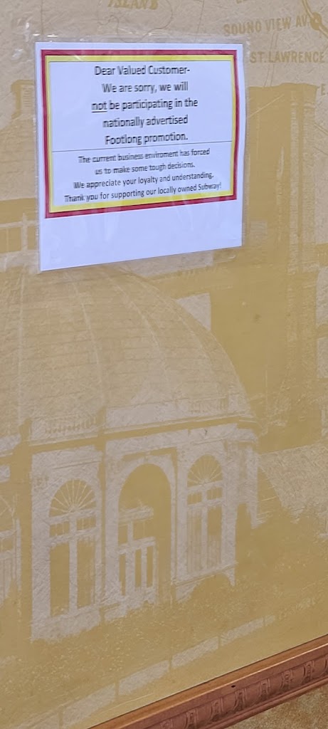 This location doesn't honor the deals that other subway stores do. I would recommend shopping somewhere else,even if you just went to another subway. I hate to be picky, but it's not justifiable to shop here; generally, the staff is not very friendly, and they often act like they're doing me a favor letting me shop there; why overpay for food that I could get for %25-30 less just going to another subway by my house,and get service from someone who isn't behaving like they are inconvenienced by you buying what they sell; never understand this attitude. A good attitude goes a long way. Oftentimes, I base the majority of my review on how helpful/kind/professional the staff is. This location just doesn't cut it.
