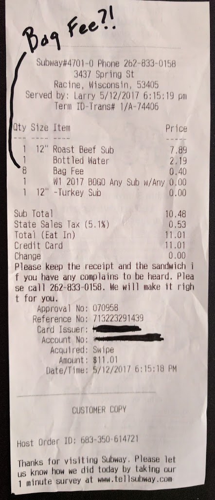 This went from a 5-star review to a 1-star review when they tried to sneak a .40 "BAG FEE" onto a sales order. Never before, including this restaurant with the exact same order have I been charged a "BAG FEE". When I went back into question what this was for, they said it was for the BAG of French Dressing on the side. (Whereas other Subways give TWO bags of French Dressing when purchasing a footlong sub.)