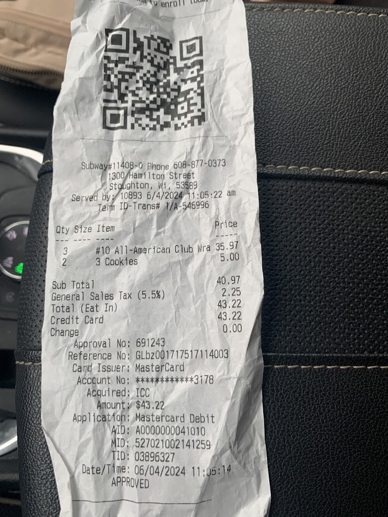 The food was fine, however, I was charged 43$ for 3 wraps and cookies. That would have been 12$ per wrap. Definitely over charged. I was in a hurry and didn’t realize it until later. I also gave her a 5$ cash tip, but , now I wonder if they just pocket the over payment.