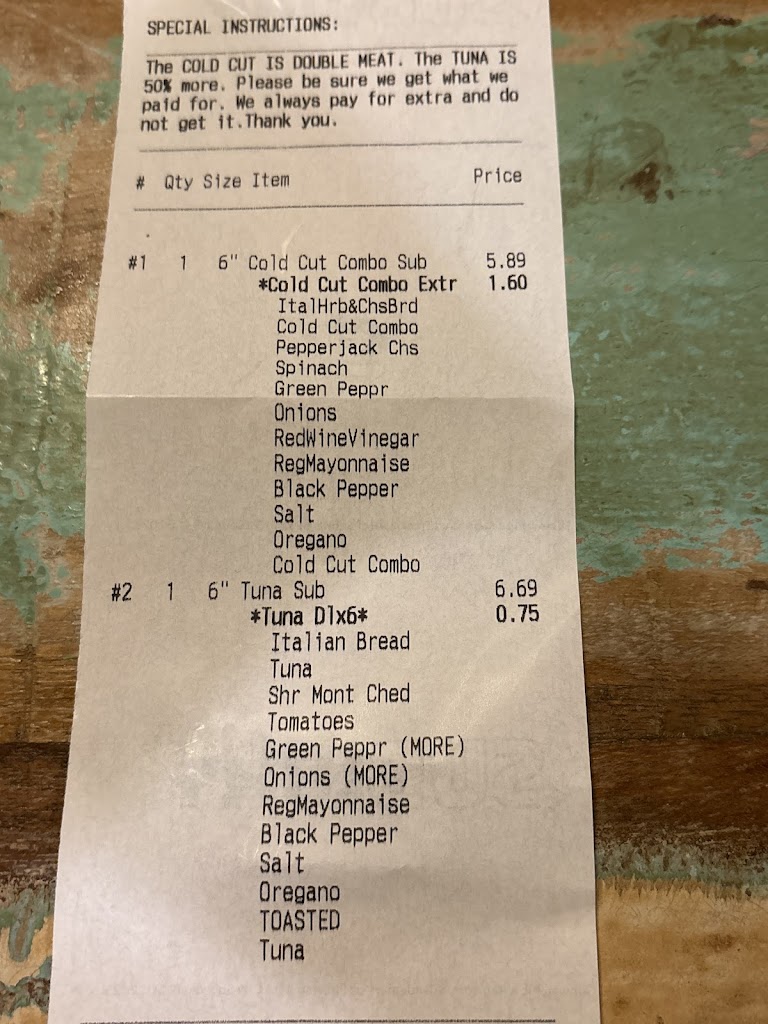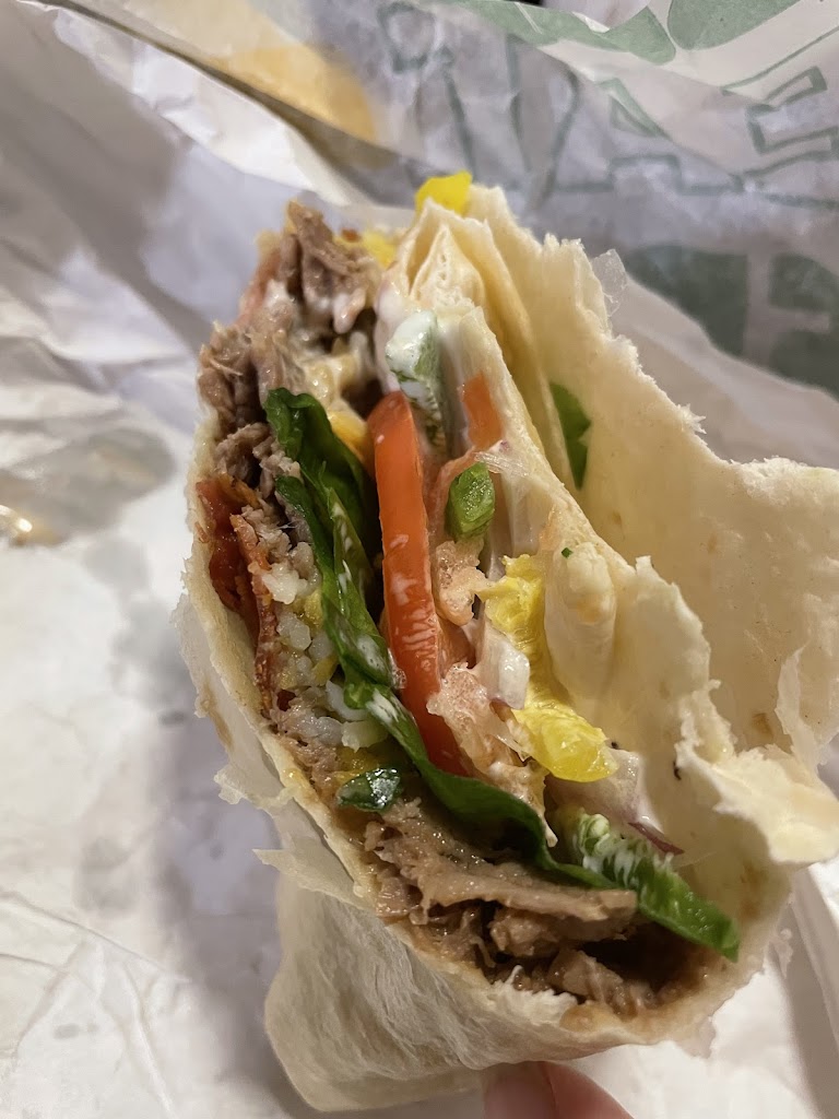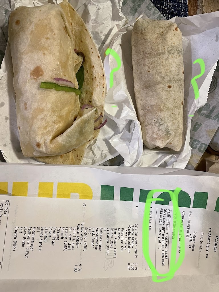 Anytime an app order is placed the sandwich is wrong and it looks like someone rolled around on it after making it. Staff argues with you when items missing. Anyone ever try to get guacamole off something? It’s green and sinks in. But the staff argue. Photos, no fresh mozzarella or avocado like it was supposed to have. Also see two wraps and the polite note to please cut each wrap in half and double check ingredients. Wraps not cut in half and missing 1/2 of the requested ingredients. Also ordered a steak wrap and added bacon and you can barely see any steak or meat. Wraps are supposed to have the same amount of meat as a footlong. AND YOU PAY FOR IT. Owner:Manager is a mean person who tells you off. There is less steak in this last pic than if I would have asked for a quarter of meat!! And I asked for a wrap which by Subway guidelines is supposed to be a footlong quantity of meat! We ask and will even pay for extra veggies. We get two slices of green peepers and two slices of onion.