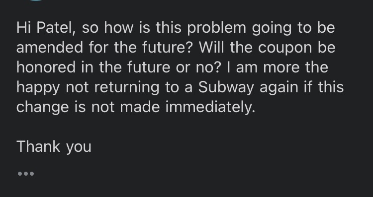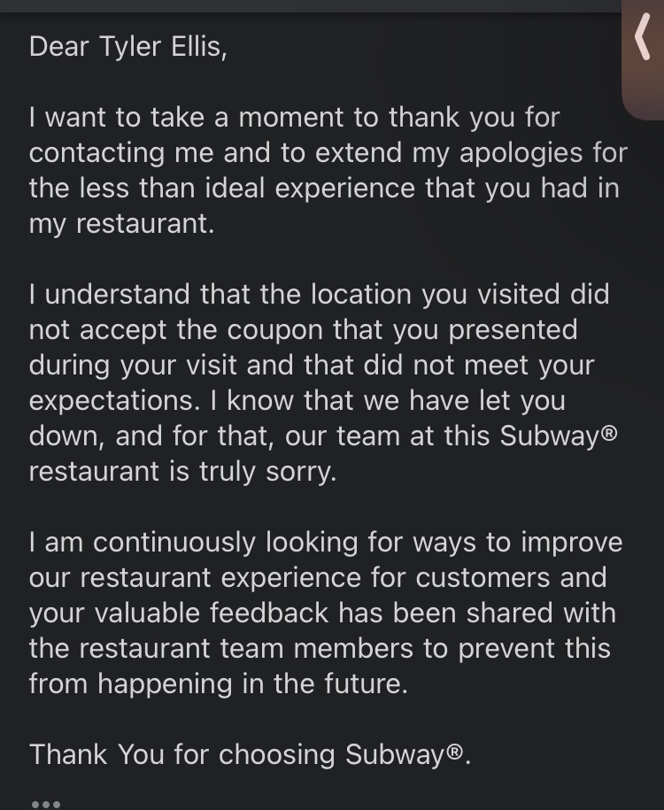 They don’t abide by their coupon deals here. I emailed corporate and this was the reply I received which was an empty apology that did not address solving the issue at hand. When I replied asking how this issue would be resolved for the future, I have yet to receive a reply. Things like this are what lose customers