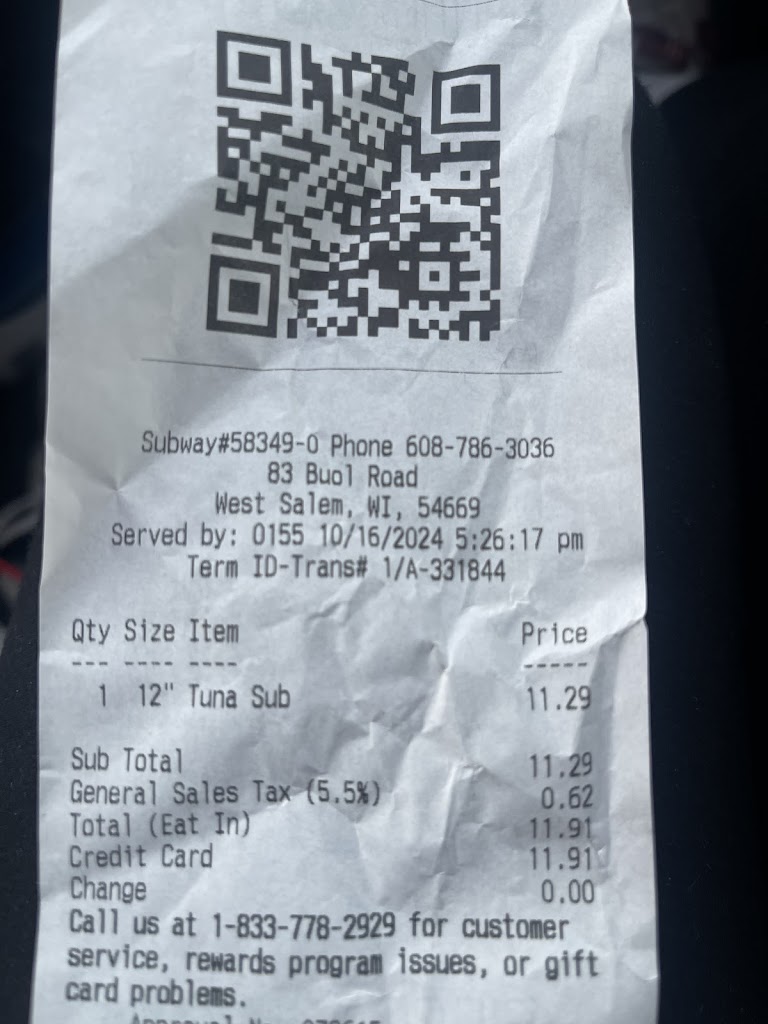 2/22/19 around 1035am watched a inspection person lick her fingers non-stop looking at papers talking to the manager. While he was making my sandwich she kept touching the food board that they slide the sandwich’s down. I called her over to the drive-window and explained what I saw and and who she was!! WOW, the inspector to make sure the workers and doing their jobs right and she can’t even keep her fingers out of her mouth and touching where the food is!!!!! TERRIBLE!!! Also she was not happy that called her out on it!!!! Wish there was 0 stars, don’t even deserve a 1 star!!! West Salam WI subway in Town!!! Will NOT eat at subway ever again!! Said they made a new sandwich and they didn’t!! Even in the drive-window we customers can still see just so you know!! No other customers while I was there so he made my sandwich on the main food line vs in the back where they normally make them for the drive-window. Saw everything! YUCK!!!