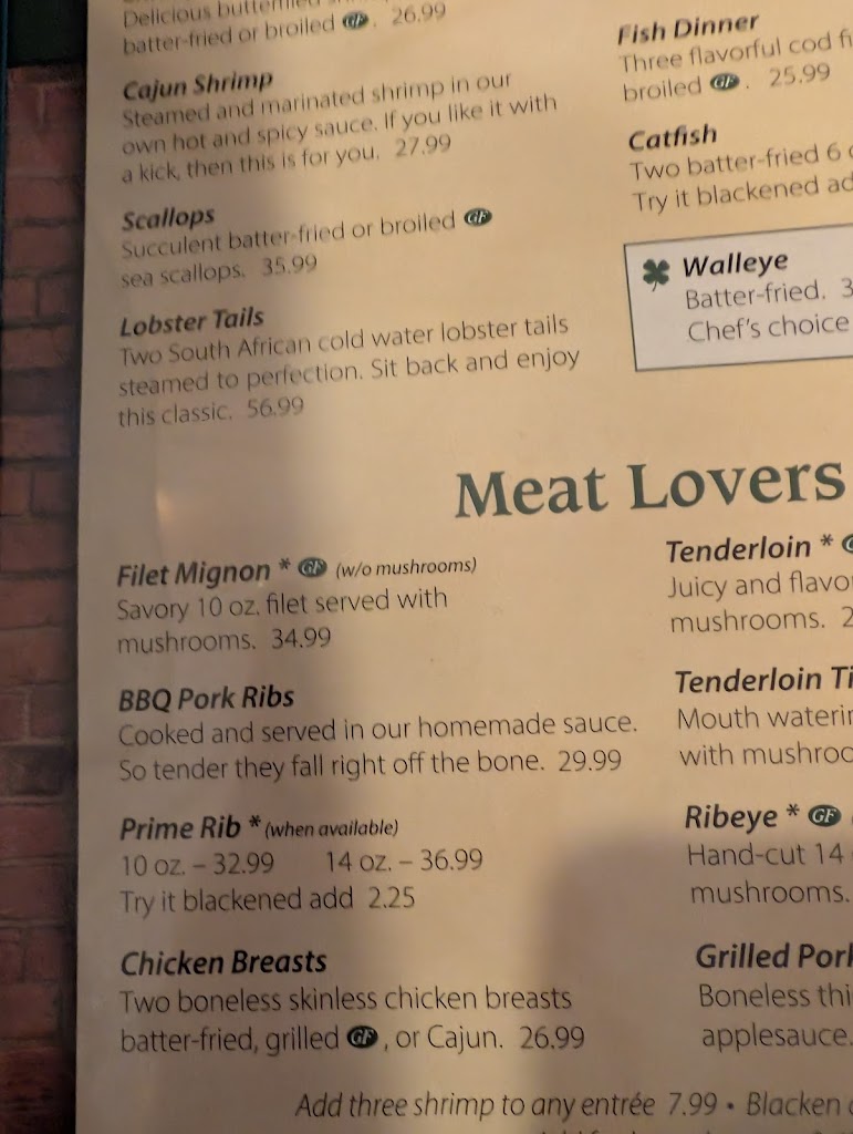 My grandpa came to visit from California, and this is a great meeting place for our family get-together! I love yhe tenderloin tips with baked potato always made with perfection. The fish my wife and mom had was so good they didnt even share!