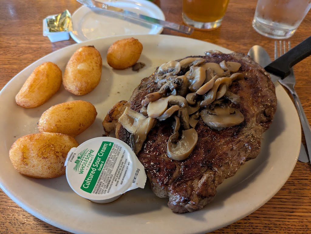 Excellent tips/mushrooms and butterflied shrimp. The salad bar never disappoints!