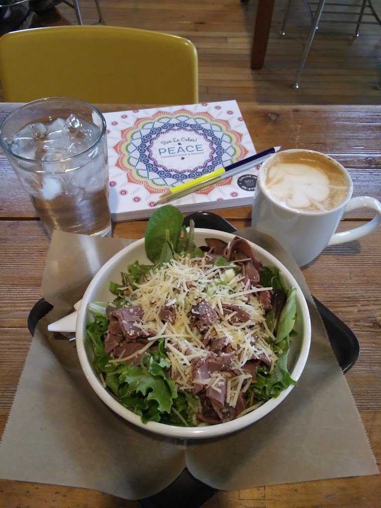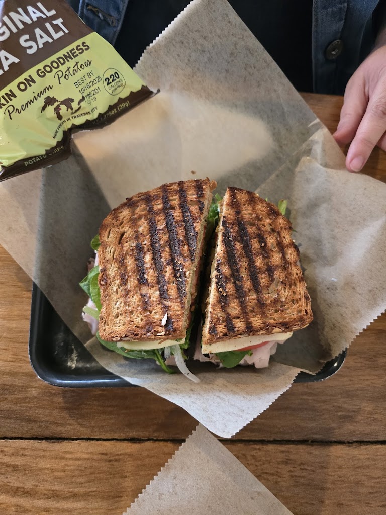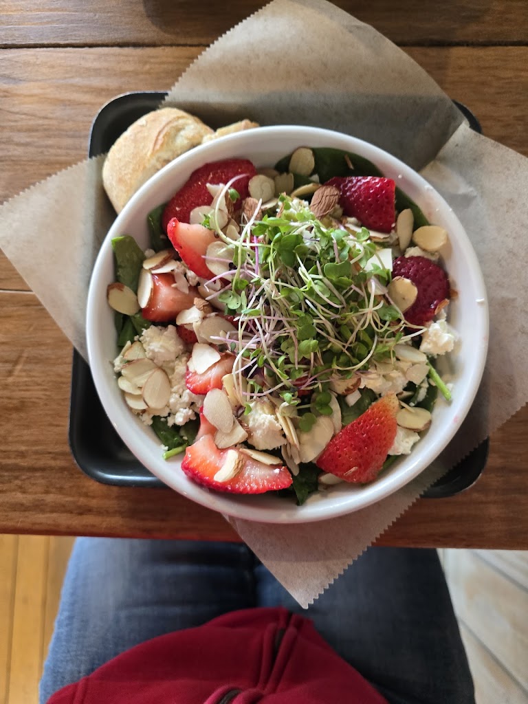 I went in for lunch with my pastor, and everything about it was easy, warm, and just what I didn’t know I needed. I had the spinach salad with fresh strawberries, goat cheese, almonds, and microgreens (total flavor bomb), and she had the toasted turkey sandwich — that thing smelled amazing and looked even better.