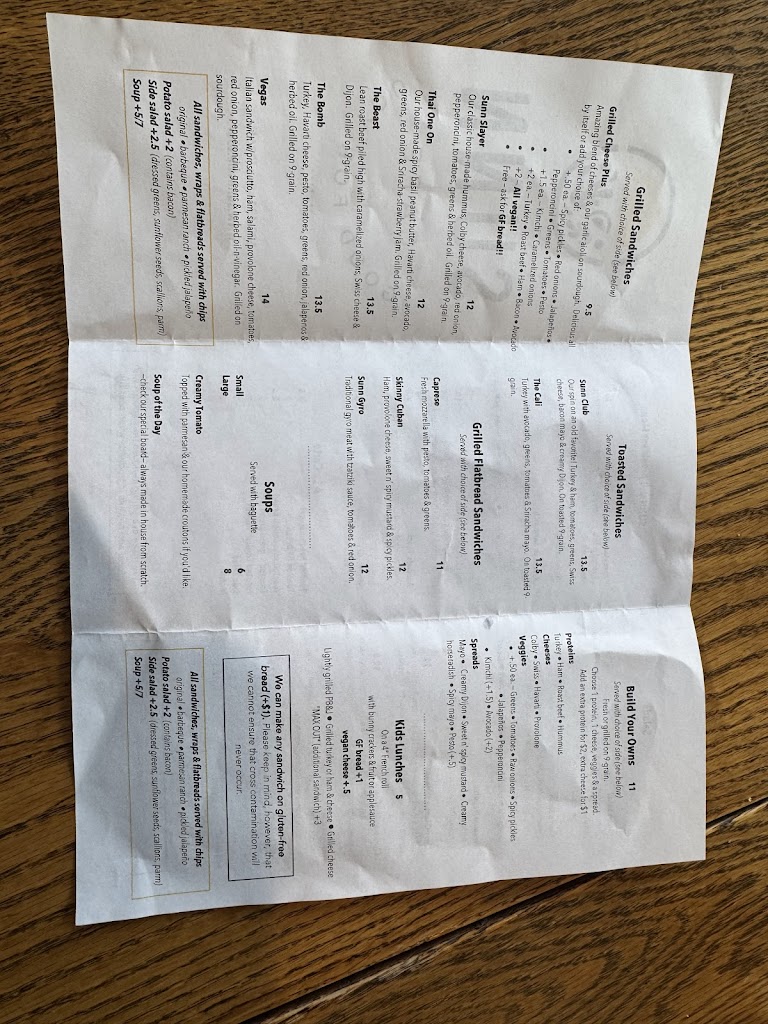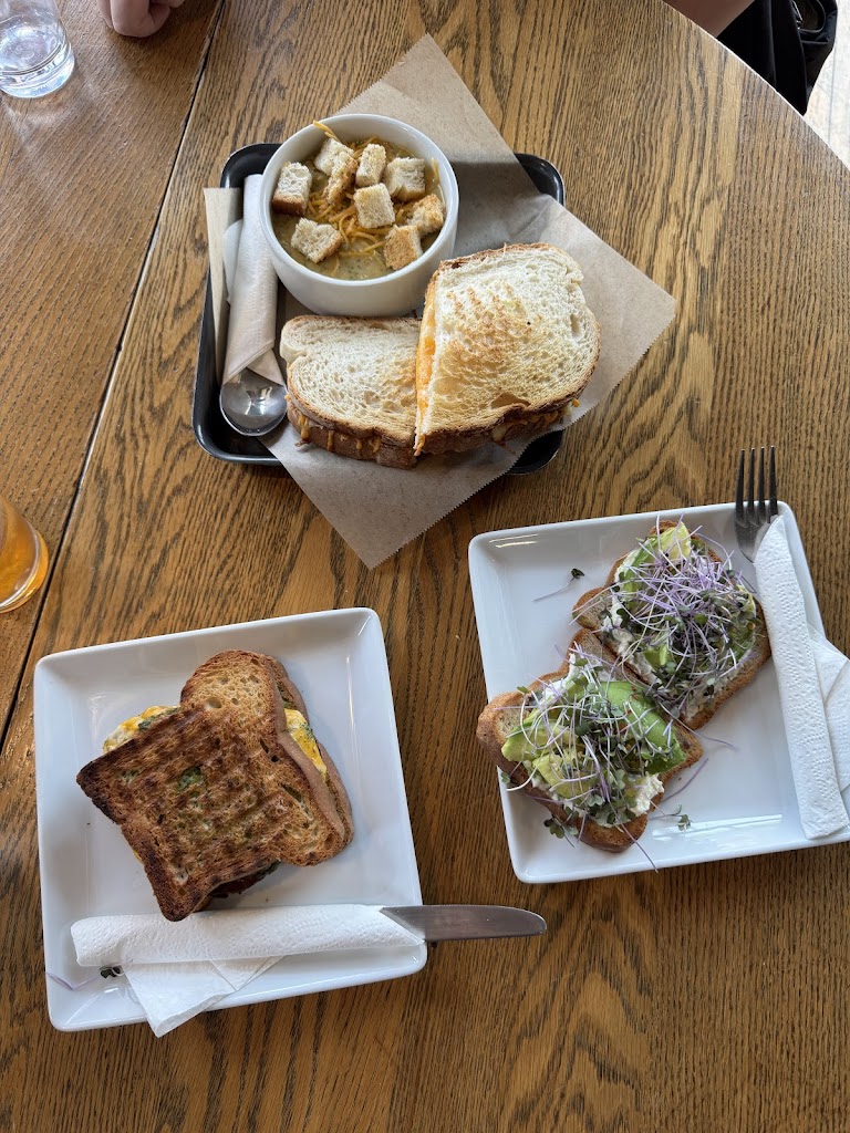 g) Food was tasty. All items were enjoyable. We had the Avocado Toast (GF bread), Breakfast Sandwich (GF bread), Grilled Cheese with side of Broccoli Cheddar Soup.