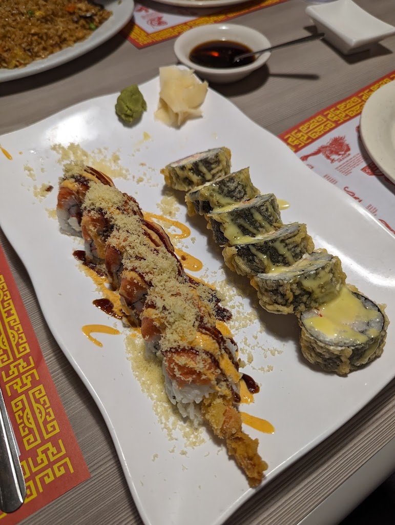 Um the food was mostly cold the service was good the sushi was good but the chicken was dry the heavenly chicken tasted like syrup was on them and for 2 people it was 48$ and on the sign said drinks were included turns out there not