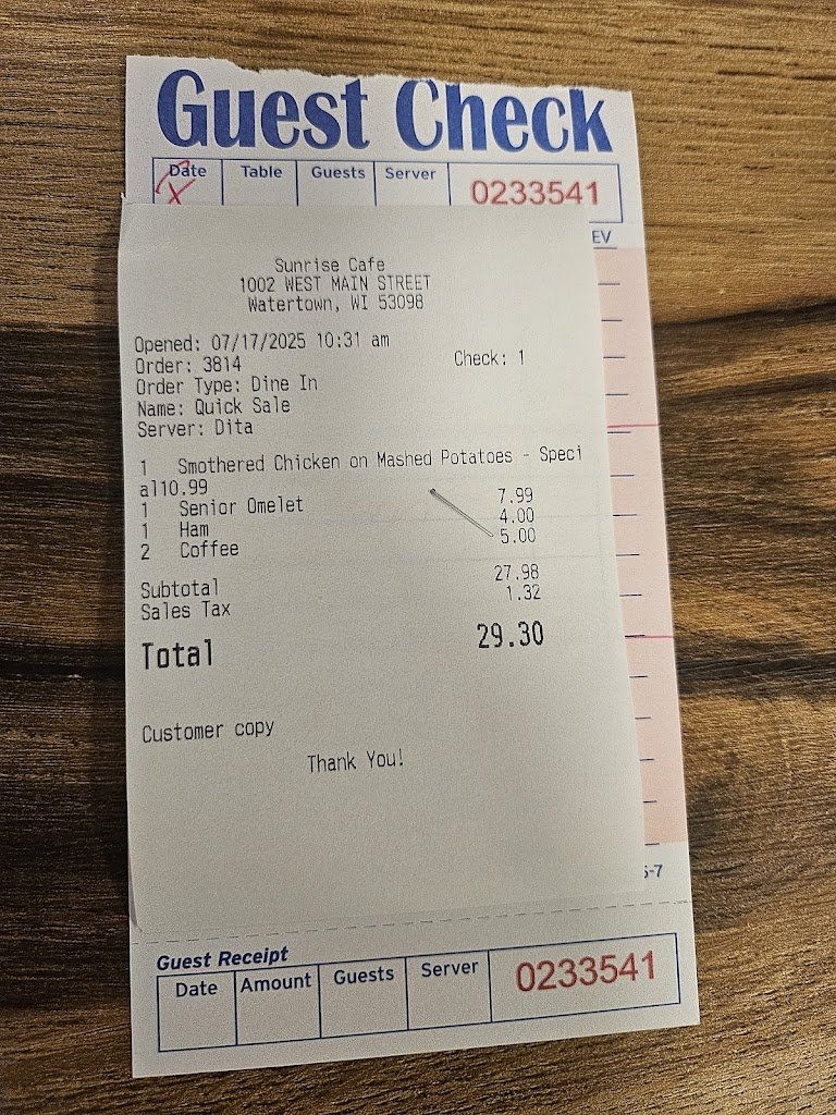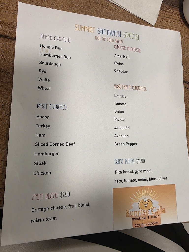 The food was amazing! I got a chicken quesadilla with fries and I LOVED it!! I would recommend sunrise for how good the service is the food and the atmosphere it was amazing I felt welcome as soon as I walked in.