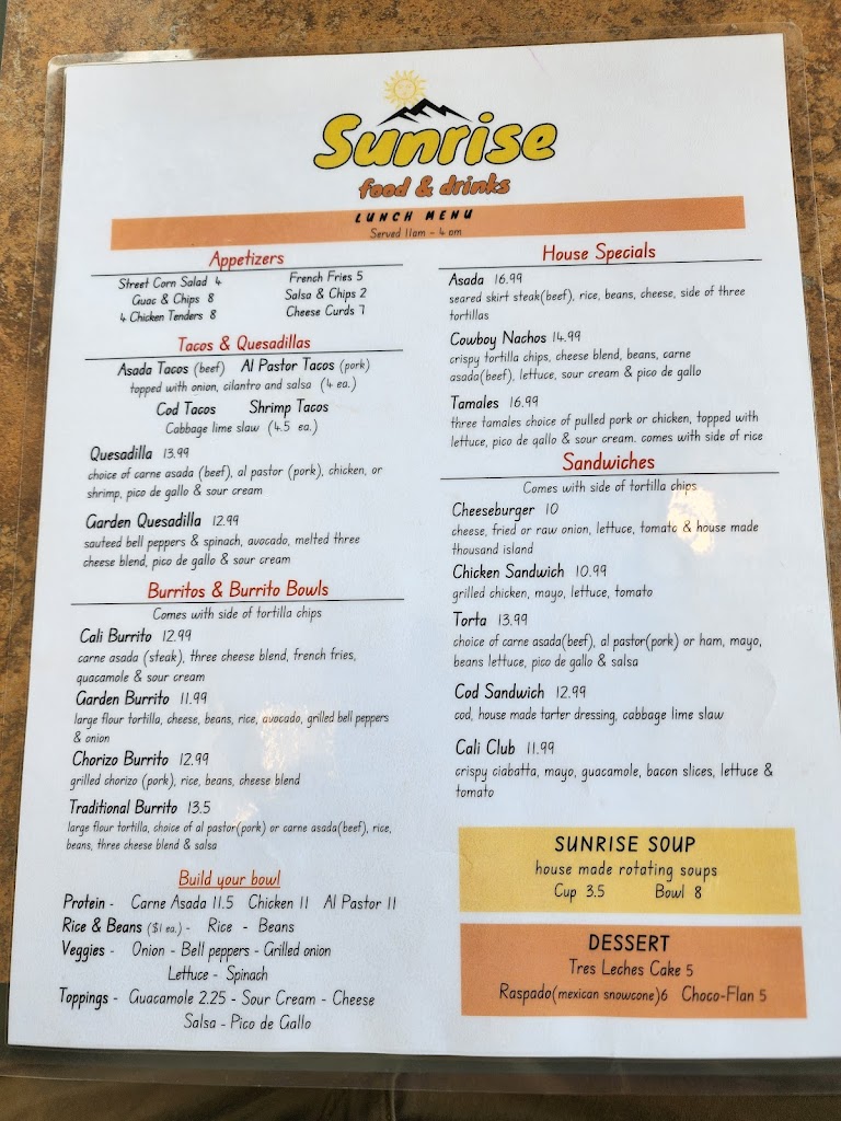Absolutely one of our most favorite experiences in Door County! We wanted Mexican food & stopped for lunch after reading their reviews. Sturgeon Bay is so lucky to have authentic Mexican food for a reasonable price. The owner/server Christina was absolutely wonderful! We started with their homemade guacamole & chips which was so delicious ♥️🥑 Then our lunch order arrived. I had a grilled chicken quesadilla & my husband had a chorizo burrito. 🌯 Both lunches were outstanding. Christina visited with us about their restaurant & family. It was so nice to have someone that was so friendly & cared about her customers. We wish the Sunrise Cafe all the best as they continue to bring a great eating experience to Sturgeon Bay ♥️