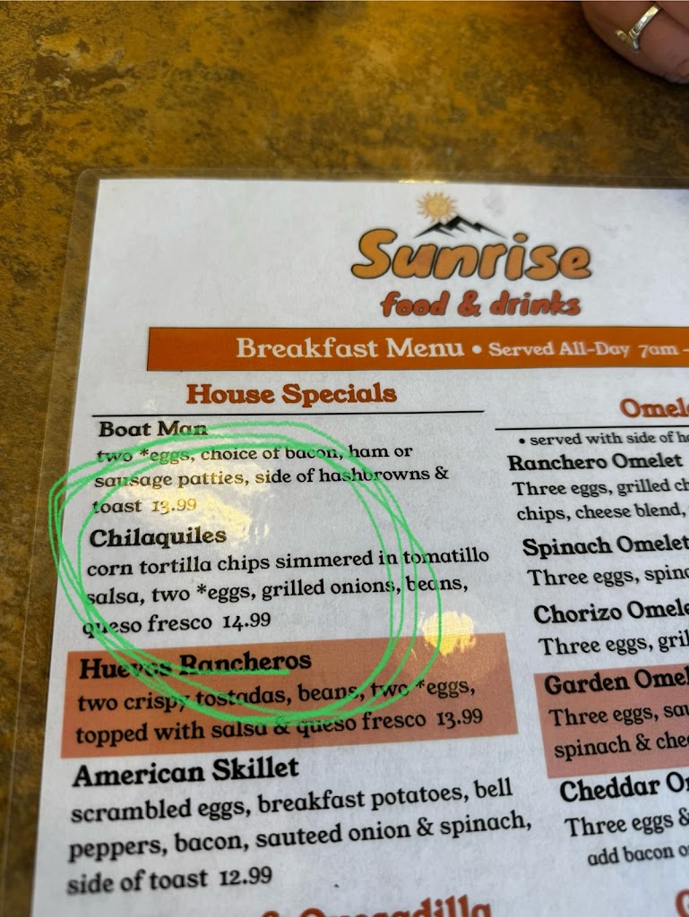 Me and my grandma had a great time here! The food and the service was super fast. I We enjoyed the Boat breakfast and the Chiliquiles!