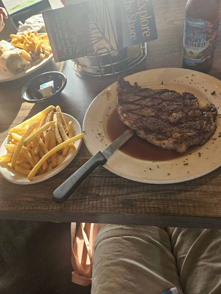 Gorgeous view of the sunset over the lake as we enjoyed our dinner. Both the prime rib and coconut shrimp were very good, as were the sautéed veggies and the excellent cream of mushroom soup. Superb friendly service and a very good value. Highly recommended.