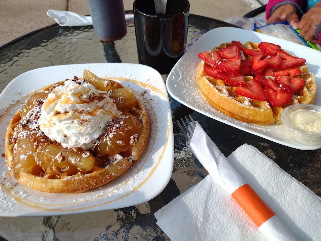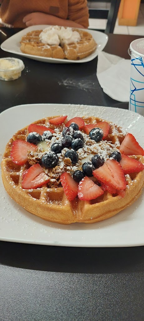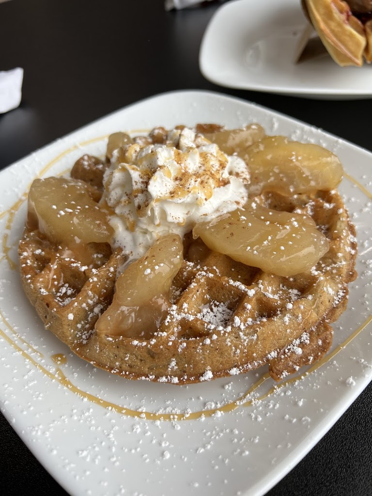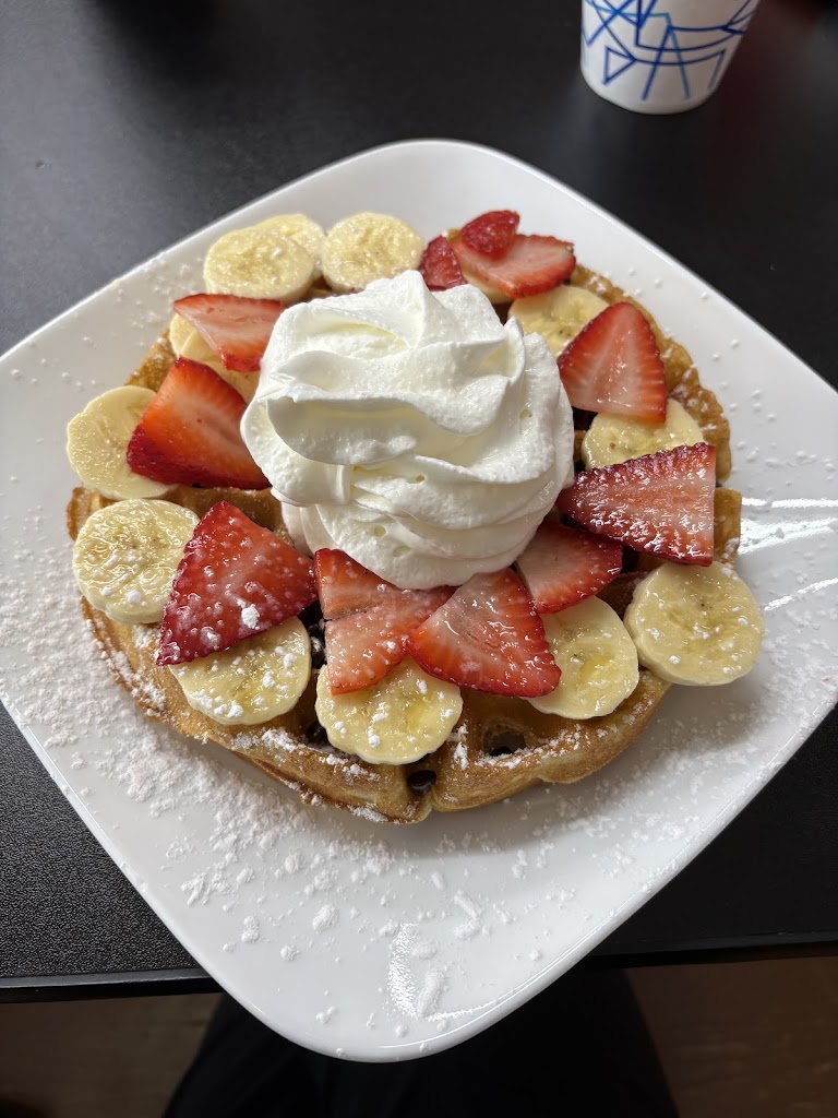 Variety of waffle choices, good coffee, service is excellent. Sunny indoor and outdoor seating. I love the front window tables. Relaxing atmosphere. Promotes local artists.