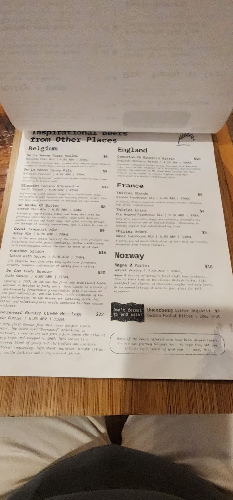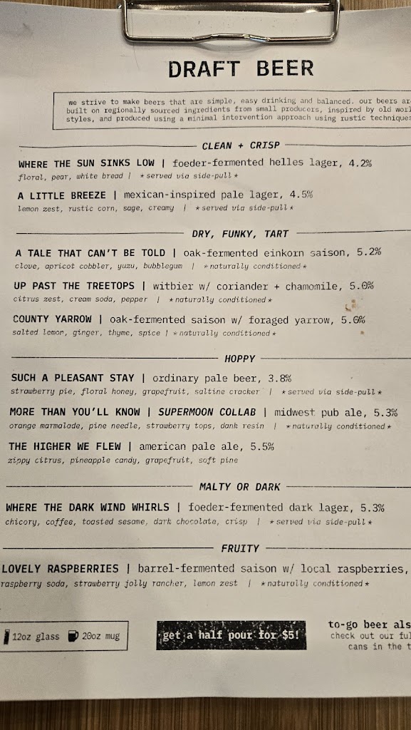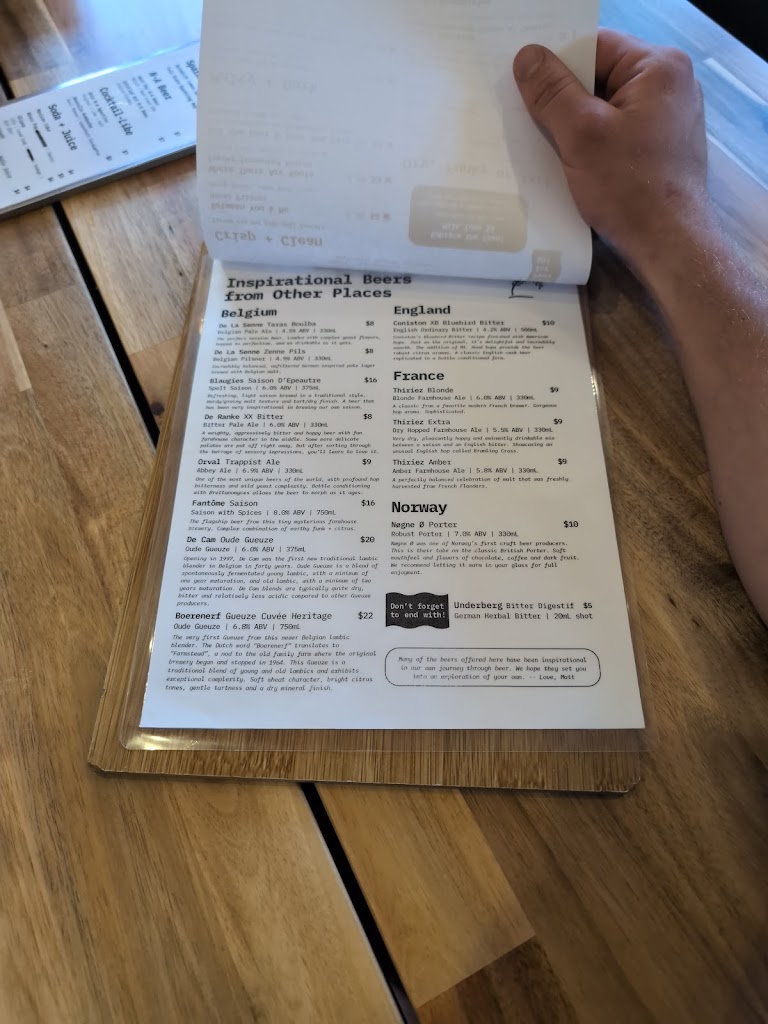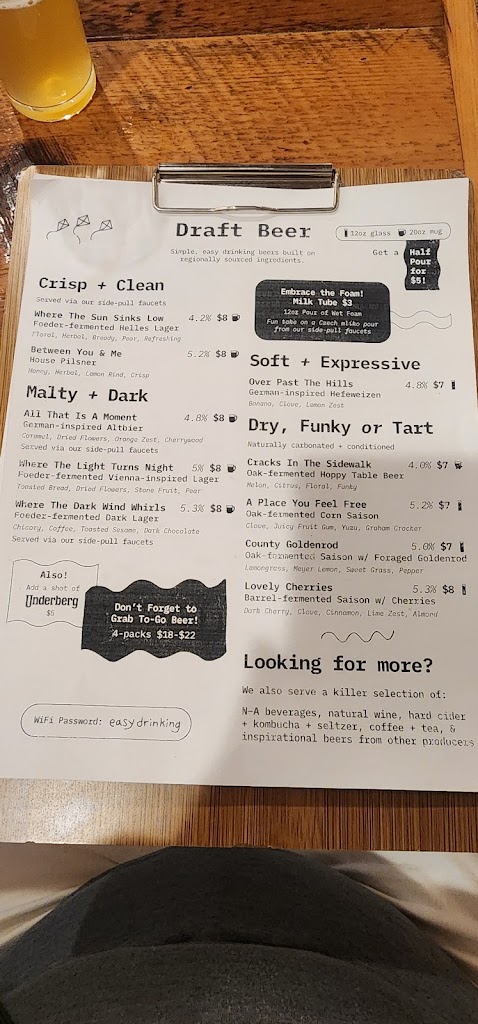 foeder-fermented dark lager and he had “a lovely place to be” oak-fermented spelt saison. Beer was delicious we will be back again. Smooth and easy to drink.