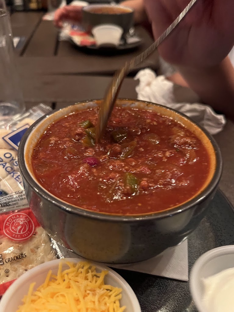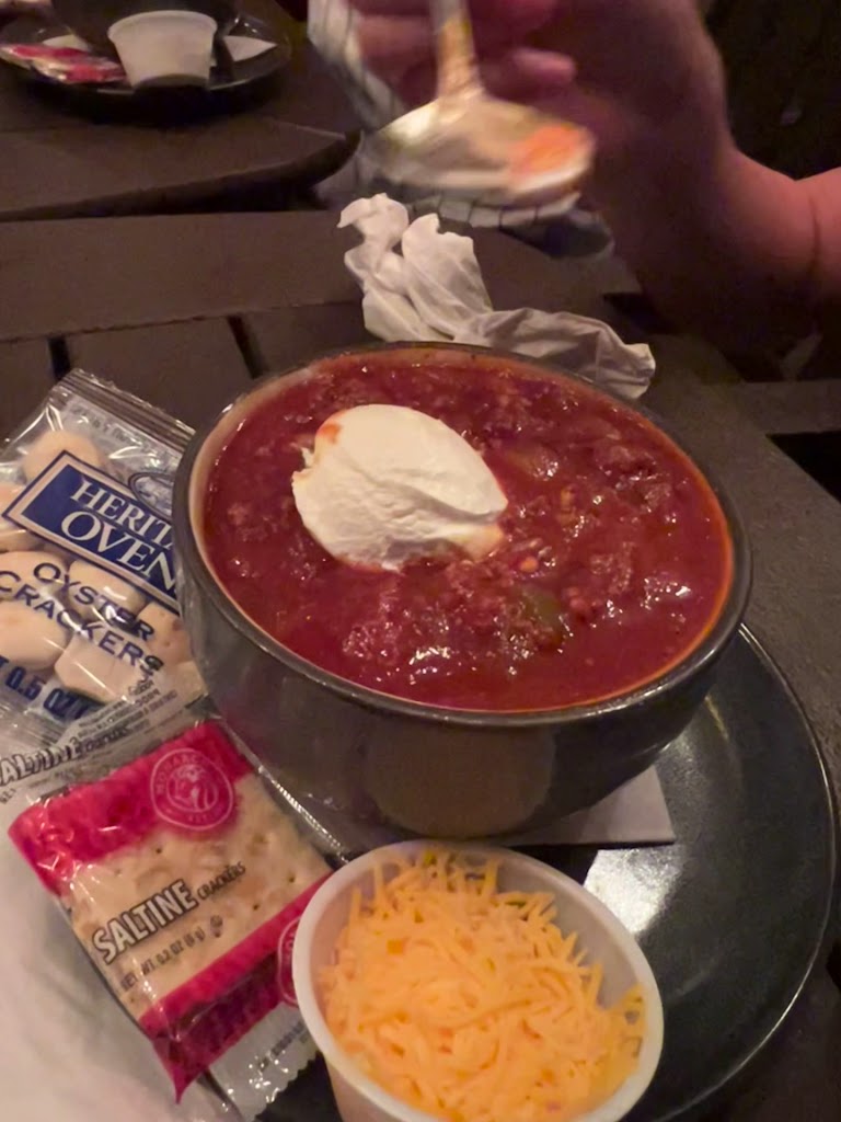 August the 13th most of the family stopped in and had some delicious food 😋, burger with roast beef was a nice sloppy change up, fries were crispy and tasty, chili had some kick to it but was really tasty and same for the dog 😋 outdoor seating was available and great except for some smoker hiding around the corner