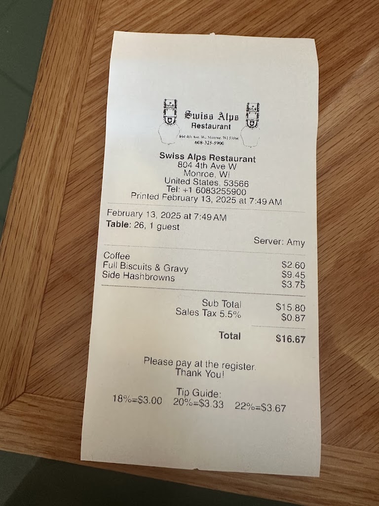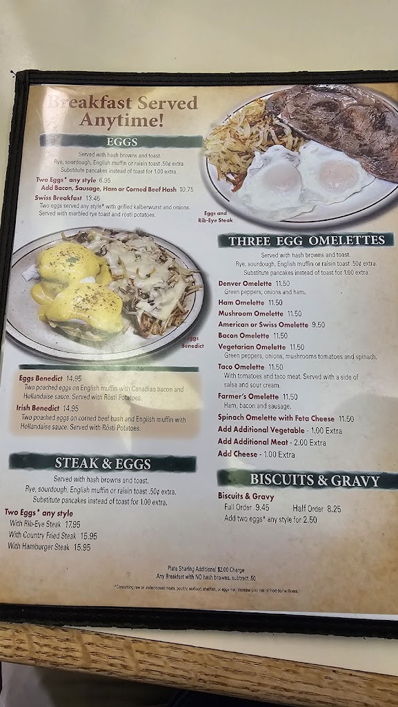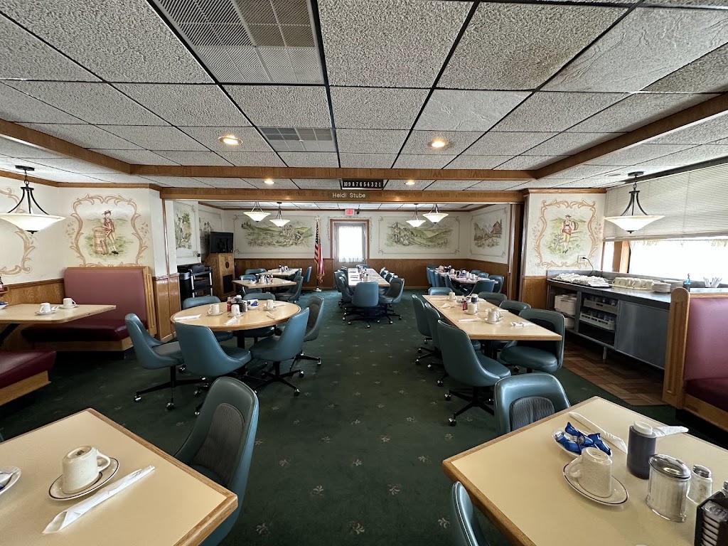 Updated to a Swiss theme, fits in with the Monroe Wi heritage. Very clean ,comfortable seating,a good menu offering a variety. Our breakfast was very tasty, service was very good,she came back several times to pour coffee ,ask if everything was good,and if we needed anything else.I had eggs Benedict that came with rushti potatoes, she had country fried steak ,she said it was good.