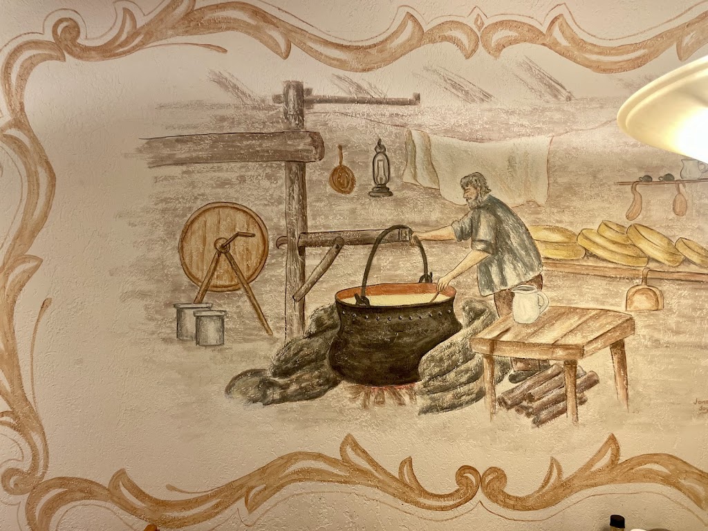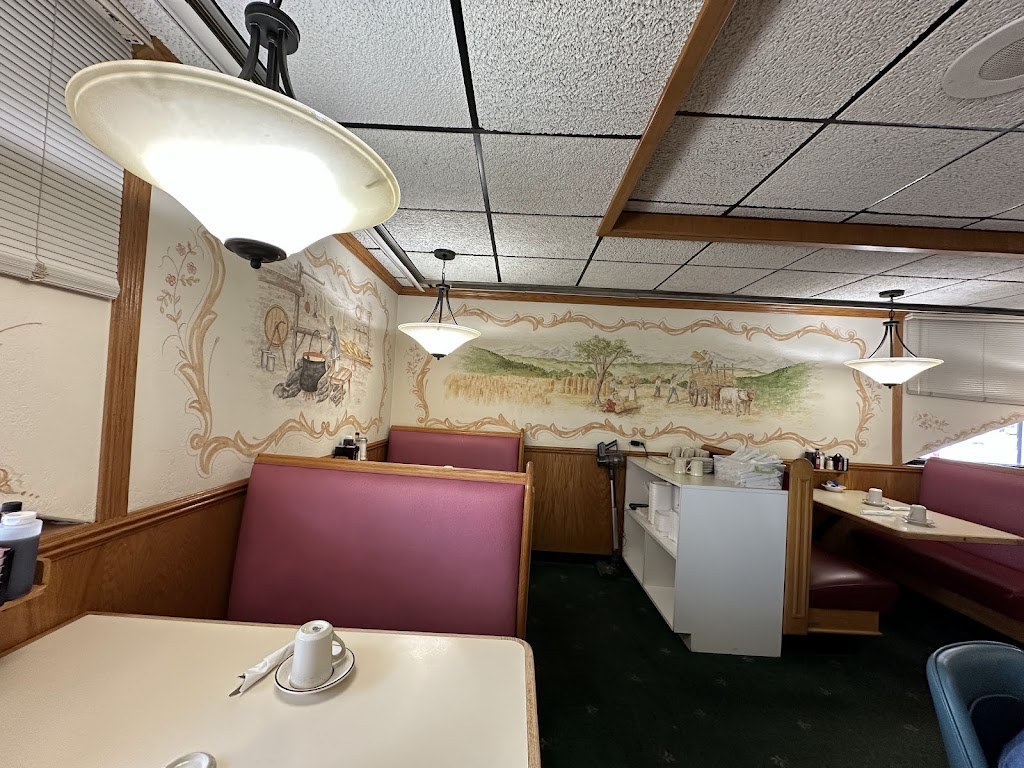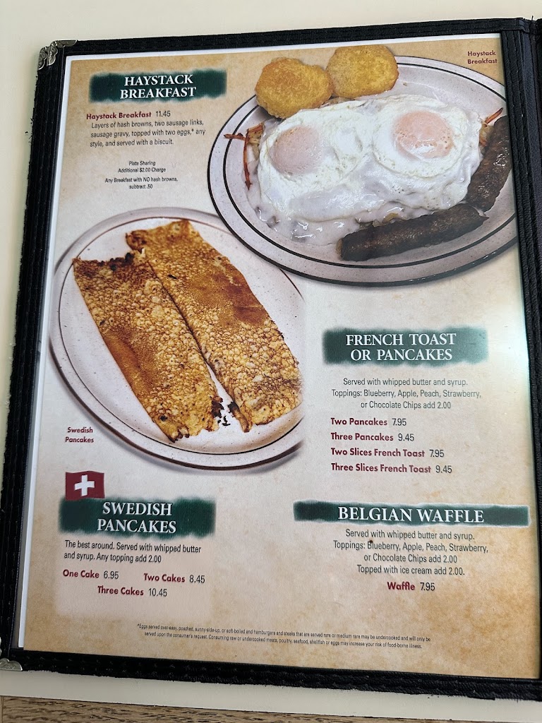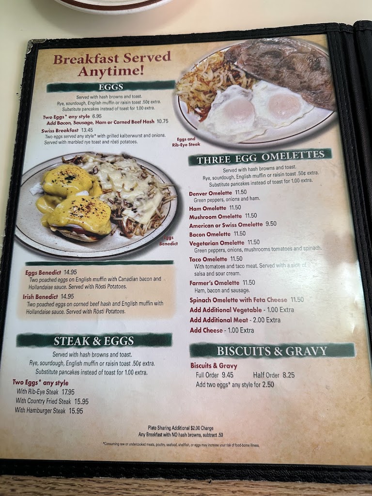 They are only open for breakfast and lunch. We walked into this restaurant that has a very small town feel with a Swiss theme. The walls were painted in a Swiss style that my girlfriend said reminded of her time spent in southern Germany. The booths and counter remind me of something from the 60s. The booths could use some maintenance and repairs. The booth we sat at the upholstery was cracked. You could see the foam padding.