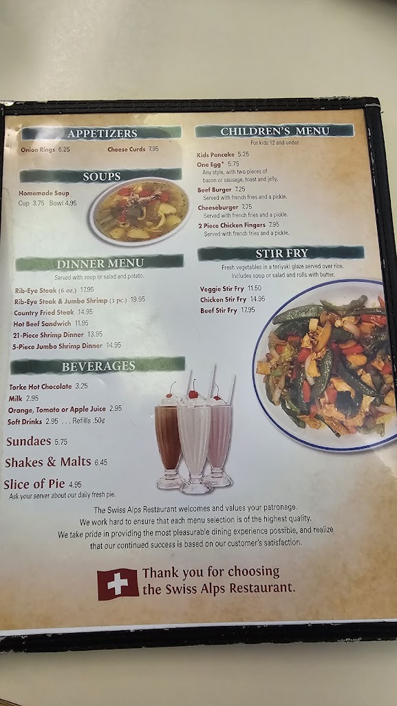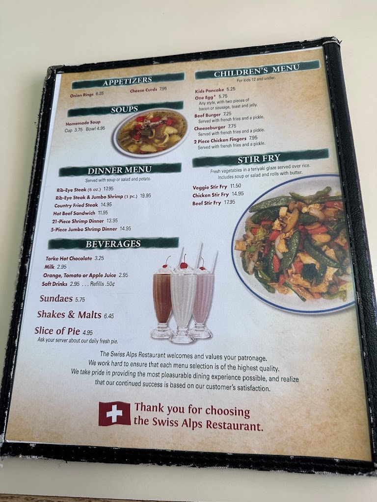 Swiss Alps is my daughter’s favorite restaurant in the area. We enjoy our family meals there. The food is consistently good and the service is always great.