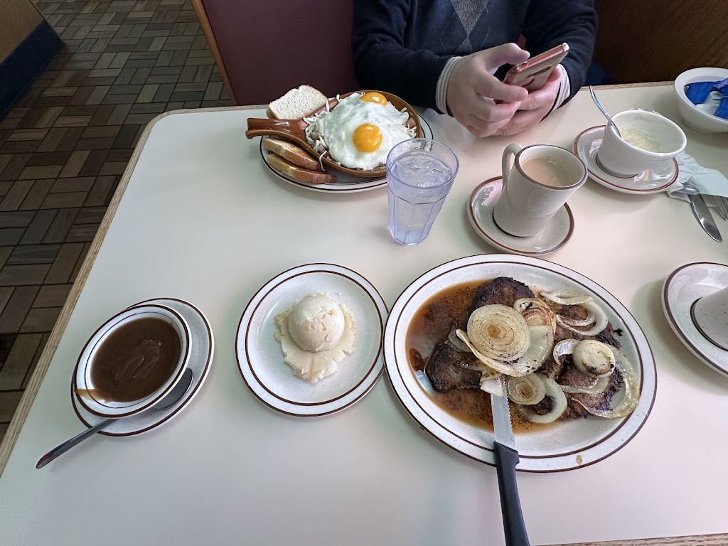 As for the food… Well… You have to love a small-town family restaurant. I had the Country Fried steak and Eggs. It was some of the best Country Fried Steak and Eggs I’ve had in a long time, and definitely the best I’ve had in the region. When it was brought to the table, I didn’t have high expectations as the Gravy looked like it was going to be a plain white gravy with little to no flavor. First impressions can be very wrong. It had a great flavor and was delicious. The steak was cooked to perfection. The breading was a crispy, flavorful delight. I had zero complaints. It came with hashbrowns. Normally when I order hashbrowns I ask for them to be fried extra crispy because I feel it adds to the flavor. I forgot to do this, but I didn’t need to. They weren’t as cooked as I prefer, but they had a great flavor that, when mixed with either the eggs or gravy, were absolutely delightful. My girlfriend ordered the eggs and hashbrowns and was impressed by the hashbrowns before I even had a chance to taste them. They were great.