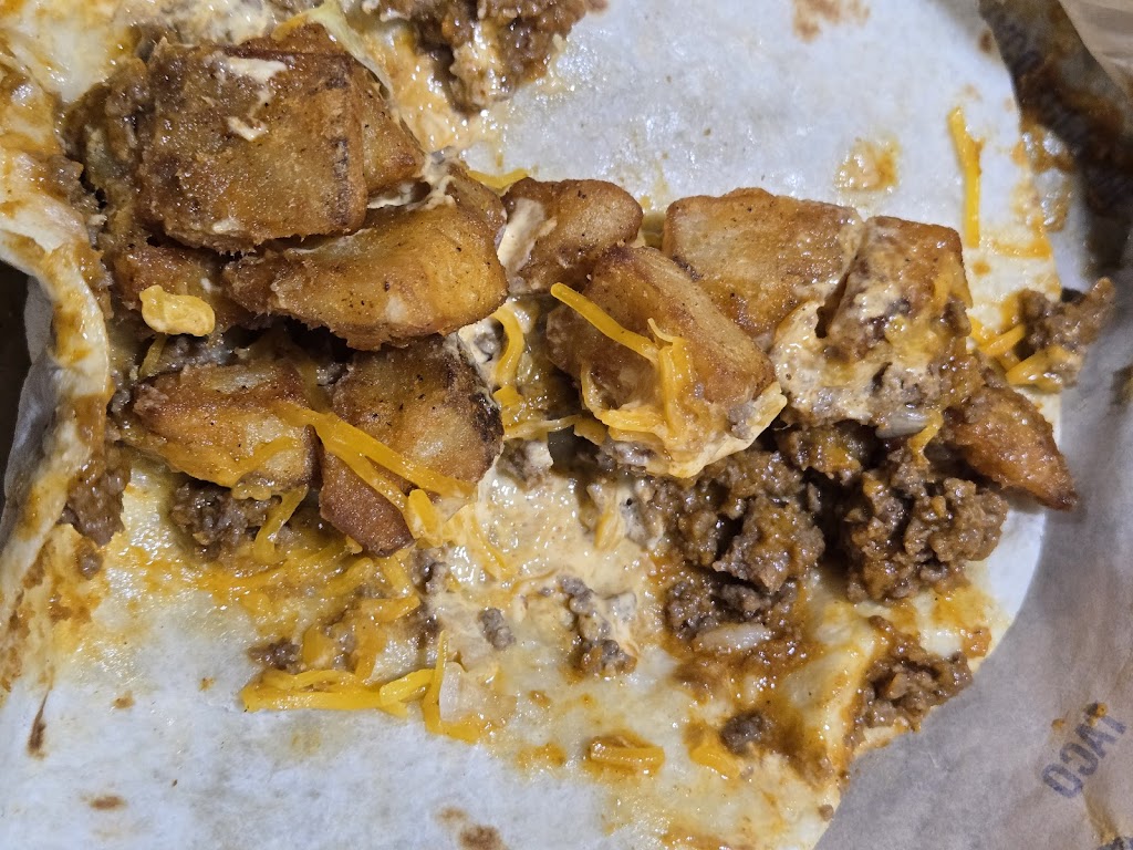 On a good note... The amount of ingredients went up. What sometimes we would get was a third full taco was actually full this time, mostly with lettuce, but at least they weren't empty. So that's positive, most of the places out there are going down in portions even when raising prices. Rest of the food was fine. But the chips and cinnamon twists were dumped out on the bottom of the bag, interesting flavor having chips with cinnamon sugar and then cheese dip...