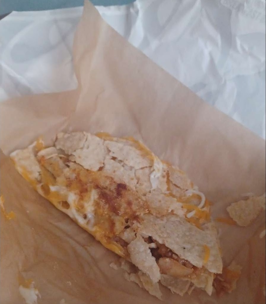 There I was. Starving, famished. I hadn't eaten all day and foolishly thought I could spend my hard earned money on an overpriced taco to restore my strength. What awaited me in the wrapper is the atrocity that is in the picture. If you couldn't tell by looking, (I know I couldn't.) this is a cantina crispy chicken taco. In all its glory, it is inedible, room temperature, and wholly dissatisfying.