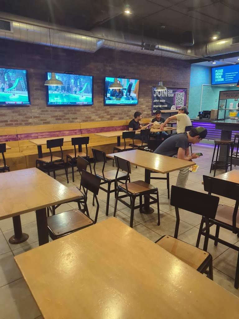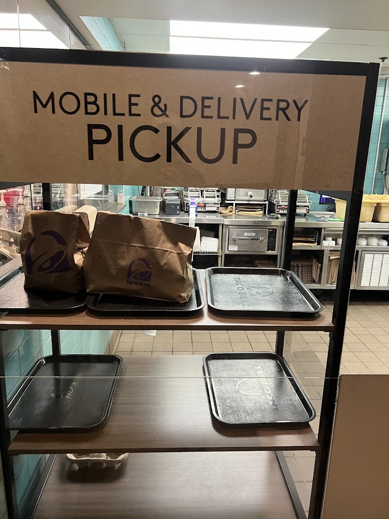 They have two signs in different spots for where you’re supposed to pick up food, both say “Mobile & Delivery Pickup”. Neither spot works, you kinda just have to flag someone down. They’ve also got an Orders screen that at other Taco Bells would tell you your order’s progress, here it seems completely unused. Why is it on just to show no names?Also they don’t serve alcohol, isn’t that what the “cantina” brand is for? The worst Taco Bell. Food is fine tho