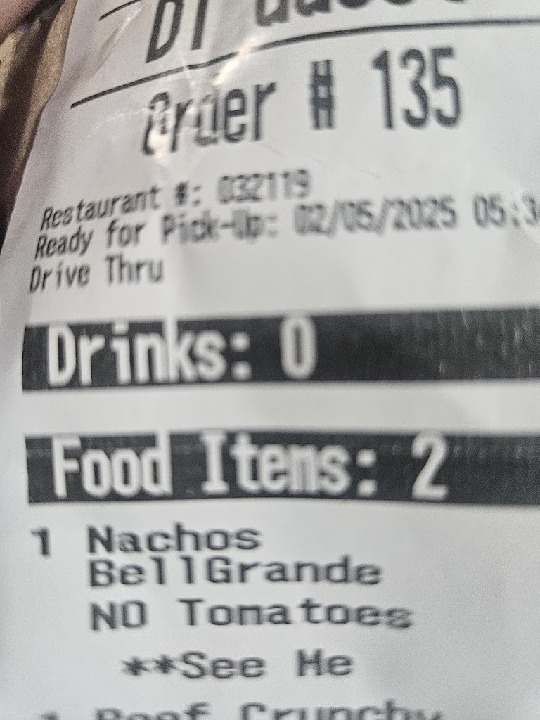 I ordered via the kiosk and received my meal after others who ordered after me. The nachos were stale. The crunchwrap and tacos were good.