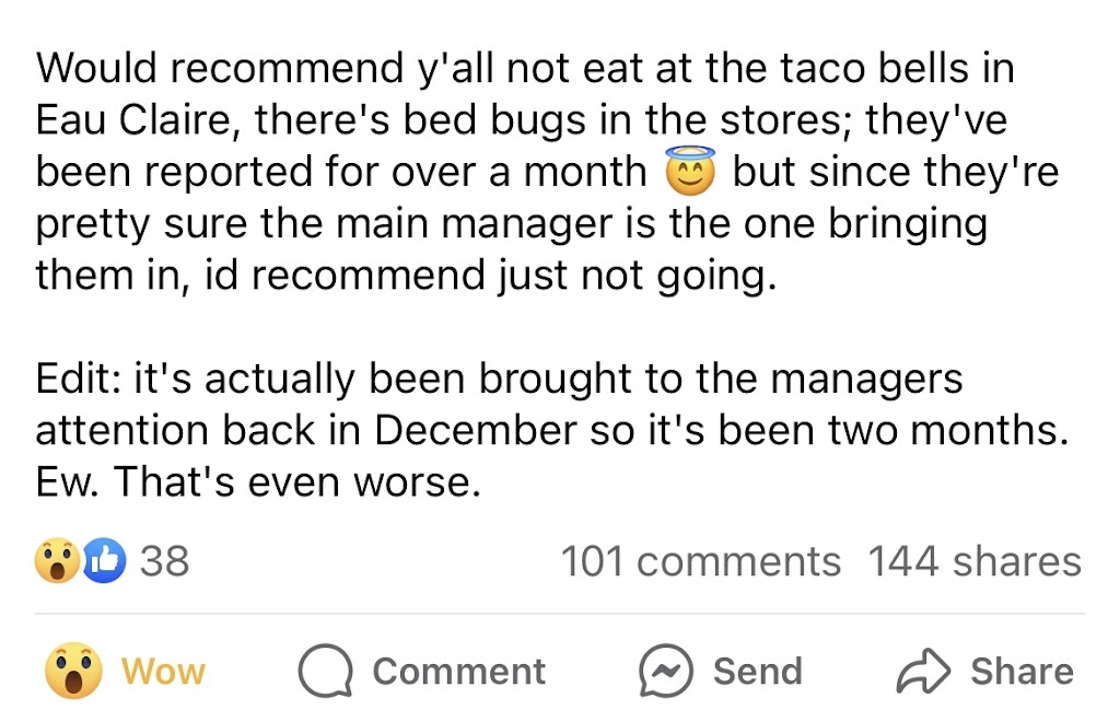 I just moveed up here from Iowa, and this store SKIMPS! we got crunch wraps (truly a work of God) but here in eau Claire these things are paper thin, they have maybe (at most) a 1/4 of the contents they serve in Iowa. There is no crunch, the crunchy hard shell layer is completely soft and soggy. I might move back to Iowa so I can get real crunch wraps again