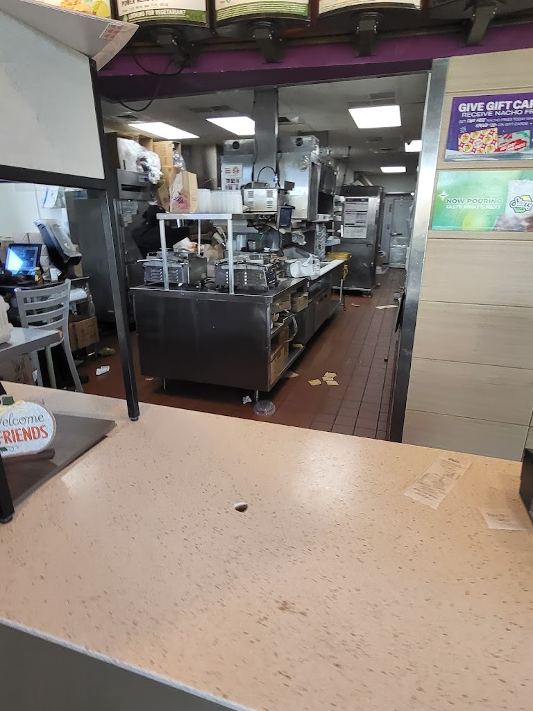 Wow! This is a new building NEW!!! and is in horrible shape already. The bathrooms both were gross and the whole place was dirty from the entry to the filthy dining area, the kitchen had several piles of dirt and food, nothing was clean. There was no service, the food was pushed at us with no greeting or even a hello. The ladies were using unprofessional language in the back which we could clearly hear throughout the building but I could also see their point, they were severely short staffed and under supplied with the amount of people coming through. For the price we paid the quality of the food and the establishment was not there and we will not return. Hopefully this is not Taco Bell standards now. 6/10/25 2:20pm