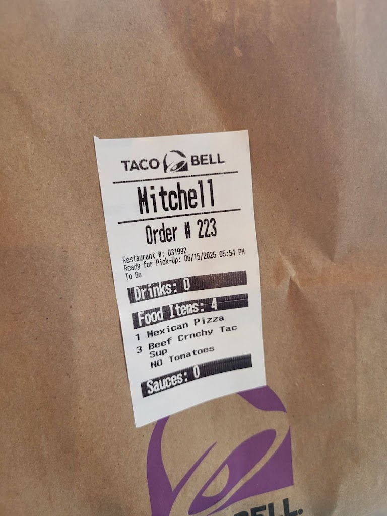 Dear worker who put tomatoes on my pizza on accident: Please don't worry about it! It happens all the time. You remade it really fast. I realized maybe you and your manager thought I was upset when you saw me taking a picture of my taco bell bag. It wasn't to complain or anything! You see, I recently came out as transgender and when you asked my name for the order out of habit I said Michelle when I meant to say Mitch. For whatever reason you put Mitchell on my order, gendering me correctly when even I myself failed to do so. I was taking the picture to post to my trans discord group to share my joy.