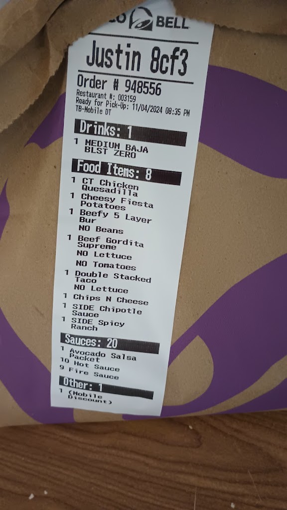 The food was probably the best we have ever had at Taco bell with there being a good amount of things inside each of the 8 different items we bought! Great job & why can't it be this way every time!