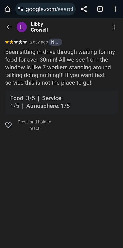 Been sitting in drive through waiting for my food for over 30min! All we see from the window is like 7 workers standing around talking doing nothing!!! If you want fast service this is not the place to go!!