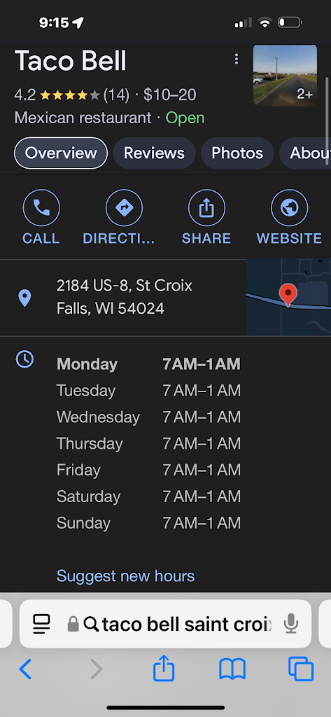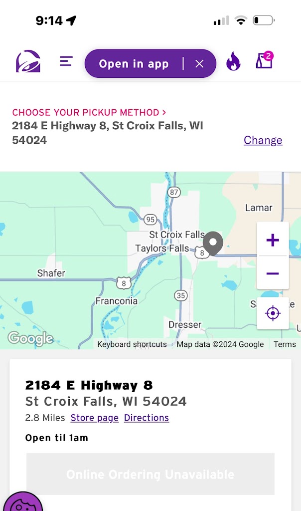 Find your nearby Taco Bell at 2184 E Highway 8 in Saint Croix Falls. We're serving all your favorite menu items, from classic tacos and burritos, to new favorites like the Crunchwrap Supreme and Cheesy Gordita Crunch. Order ahead online or on the mobile app for pick up at the restaurant or get it delivered.