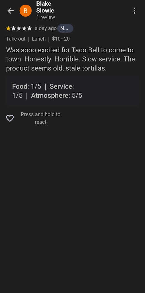 Best Taco Bell 🔔 period. It's so good, I will not go to any other Taco Bell location, any longer! This location makes the food perfect, it's fresh, & everything is accurate. The people are super friendly. Although my review score does not reflect this, the only negative i have to say about this place is: • for a newer place, you would think you would be able to order on the Taco Bell App - you can't. • Also, your hours posted online (on any search engine) do NOT match you actual hours posted in your store window. You should probably get these two things fixed, as it is costing you review points.