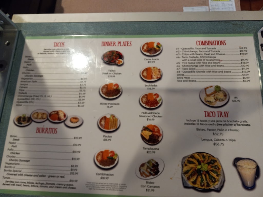 Not sure, but the menu prices I see posted are not what we were charged. 3 tacos, 3 cans of soda, and a combination plate (a #8 )came to $30. Hmmmmm???