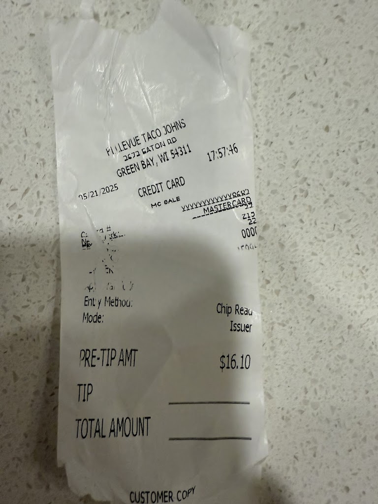 Haven't had Taco Johns since living in Madison, which was a good TJ. Just went through drive through, and typical to most drive throughs in Green Bay, my order was shorted. It blows my mind how terrible most drive throughs are in Green Bay with shorting your order. I am running out of drive throughs to give my business to.